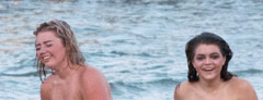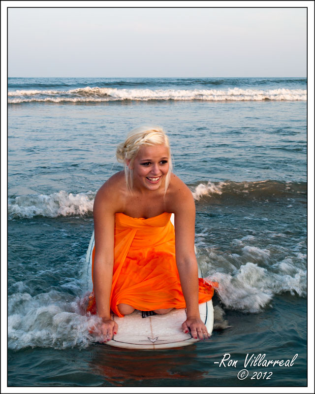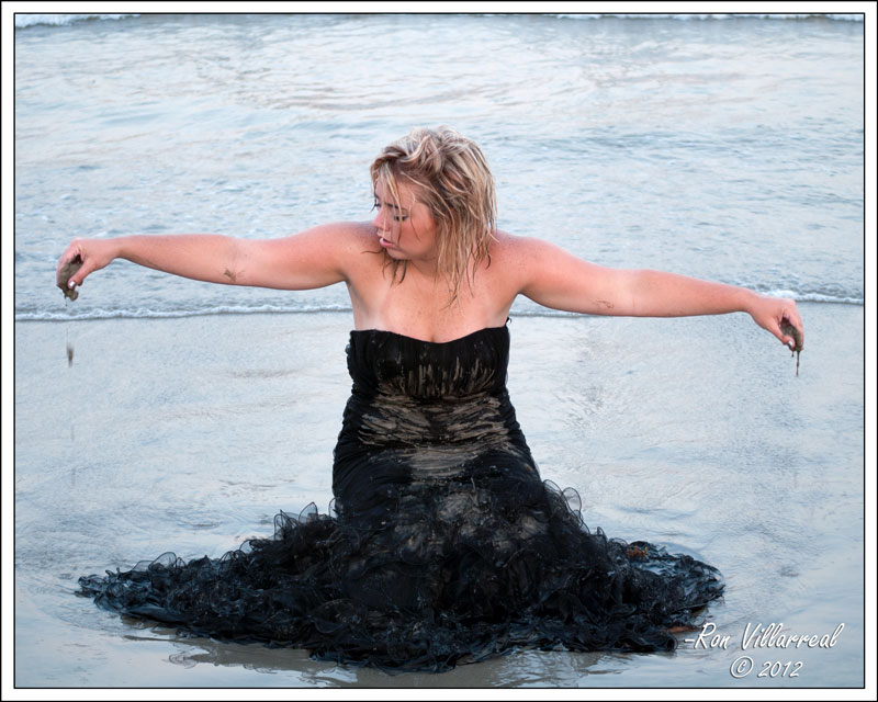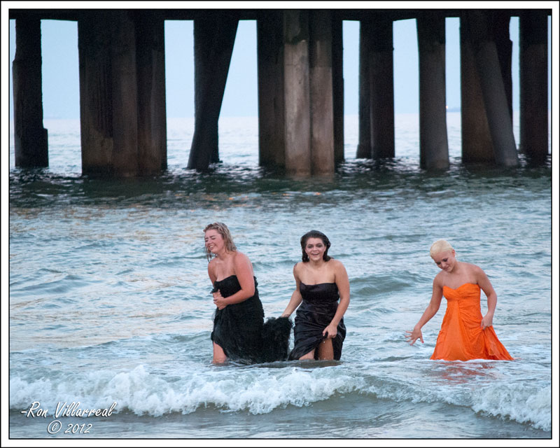 Three beautiful ladies and their gowns, in an alley, in the surf, on Galveston Island.